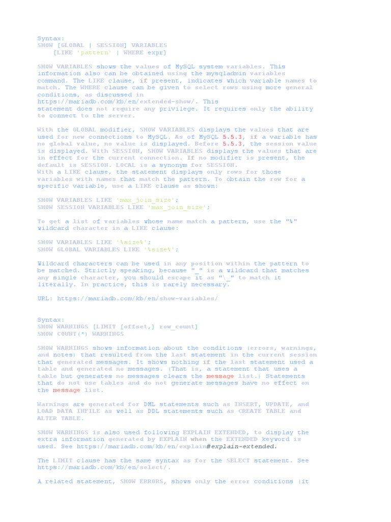 See SHOW VARIABLES for instructions on using this command. You can specify if you want the session variables or the global variables as follows. Shows the current BTITLE definition. The MySQL server maintains many system variables that configure its operation. Appinfo is OFF and set to SQLPlus arraysize 15 autocommit OFF autoprint OFF autorecovery OFF autotrace OFF blockterminator hex 2e btitle OFF and is the first few characters of the next SELECT statement cmdsep OFF colsep. ---------- Variable_name Value ---------- auto_increment_increment 1 auto_increment_offset 1 automatic_sp_privileges ON back_log 50 basedir homemysql binlog_cache_size 32768 bulk_insert_buffer_size 8388608 character_set_client utf8. System variable information is also available from these sources. It requires only the ability to connect to the server. How to repeat.