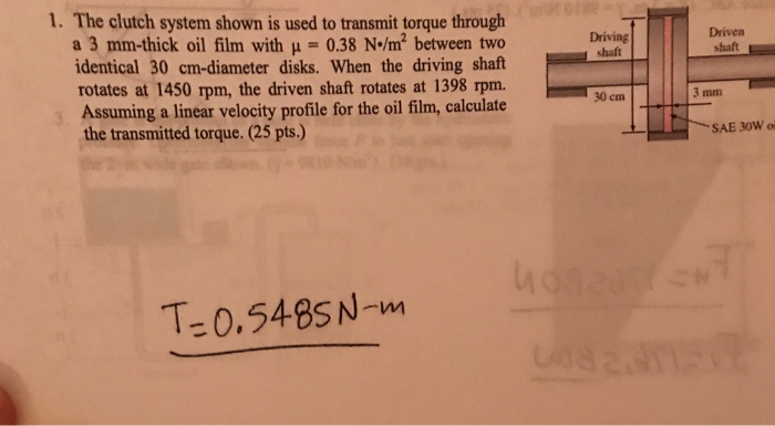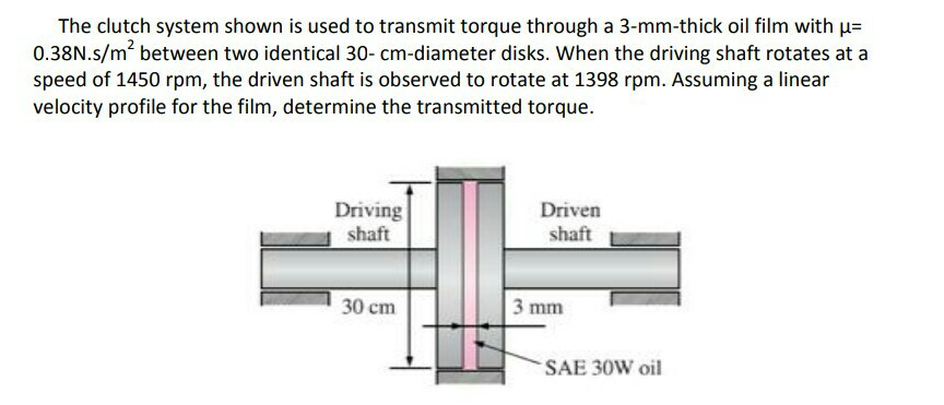 When the driving shaft rotates at a speed of 2000 rpm the driven shaft is observed to rotate at 1500 rpm. N s Average slip of clutch RPM. The clutch system shown in fig1 is used to transmit torque through a 3mm thick oil film with viscosity of 038 nsm2 between two identical 30cm diameter disks.